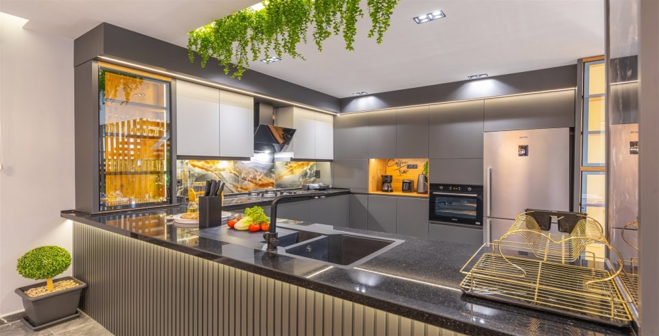 Mutfak : Şık ve modern Amerikan mutfakta bulaşık makinesi, buzdolabı, fırın, ocak, kettle, ekmek kızartma makinesi, yemek masası, yemek pişirme araç ve gereçleri bulunmaktadır.