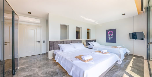 4. Yatak Odası: Bir adet çift kişilik yatak, Bir adet tek kişilik yatak elbise dolabı, komodin, klima, makyaj masası, TV ve banyo ve tuvalet bulunmaktadır.