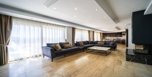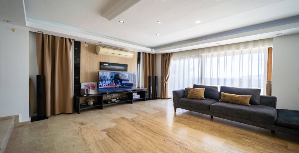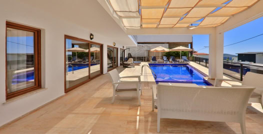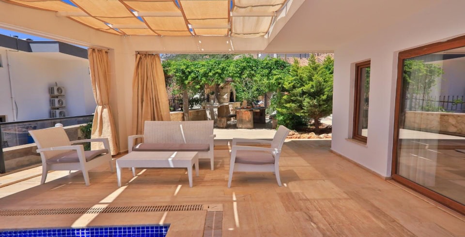 Salon : Salonda masa ve sandalyeler, LCD TV, uydu alıcı, oturma grubu bulunmaktadır. Salondan havuz kenarına çıkış vardır.