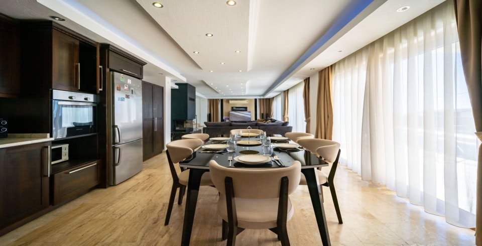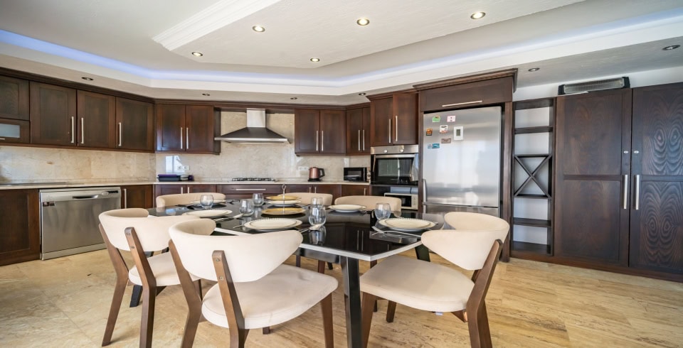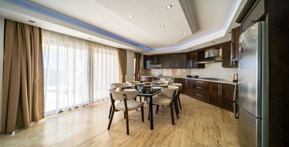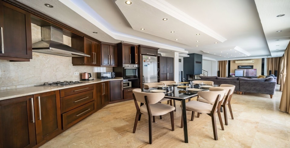 Mutfak : Villa içinde modern mutfak bulunmaktadır. Modern mutfakta mikrodalga fırın, ankastre fırın, buzdolabı, çamaşır makinası, bulaşık makinası, kettle, ankastre 4'lü ocak, 6 kişilik yemek takımı, kaşık ve çatal takımı, tencere ve tava takımı, bardaklar yer almaktadır.