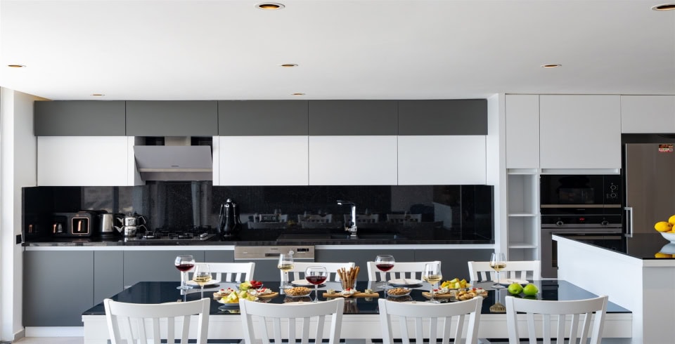 Mutfak: Modern mutfak içerisinde ankastre 4lü ocak, ankastre fırın, mikrodalga fırın, yemek masası, tost makinesi, buzdolabı, bulaşık makinesi, su ısıtıcısı, bardak takımı, yemek takımı, çatal-bıçak takımı, çamaşır makinesi, tavalar, tencereler ve diğer yemek pişirme ekipmanları bulunmaktadır.