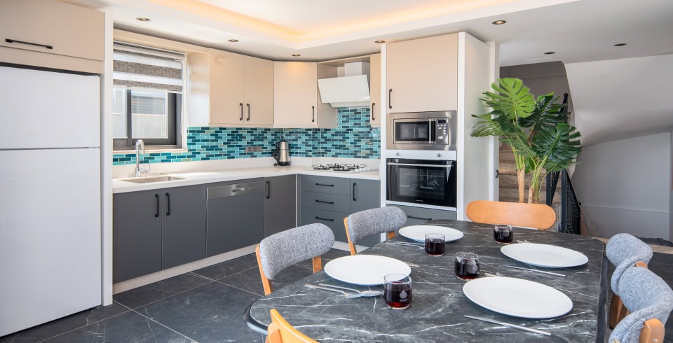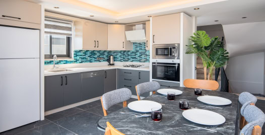 Mutfak: Modern Amerikan mutfak içerisinde ankastre 4lü ocak, ankastre fırın, mikrodalga fırın, yemek masası, tost makinesi, buzdolabı, bulaşık makinesi, ekmek kızartma makinesi, su ısıtıcısı, bardak takımı, yemek takımı, çatal-bıçak takımı, çamaşır makinesi, tavalar, tencereler ve diğer yemek pişirme ekipmanları bulunmaktadır.