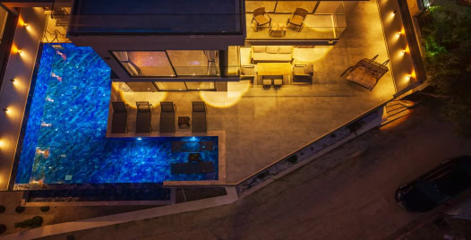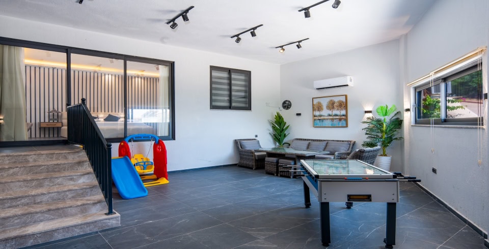 Havuz ve Bahçe : Villamızın geniş kullanım alanı bulunan teras katında özel yüzme havuzu, şezlonglar, güneş şemsiyesi, barbekü, bahçe masası ve sandalyeler bulunmaktadır.