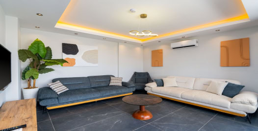 Salon: Villamızın geniş ve ferah salon katı içerisinde oturma grubu, LCD TV, yemek masası, kablosuz modem, uydu, sehpa, ütü, ütü masası, elektrik süpürgesi, klima, banyo ve tuvalet bulunmaktadır. Salondan havuz terasına direk çıkış yapılabilmektedir.