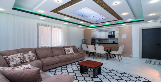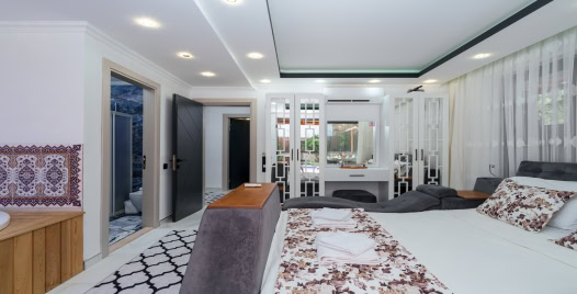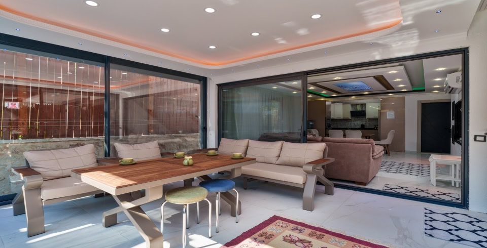 Salon : Sizi şık bir oturma grubu ile klima, televizyon, internet, uydu, koltuk, sehpa ile ferah bir salon bekliyor olacaktır. Havuz terasına çıkış yapılmaktadır.