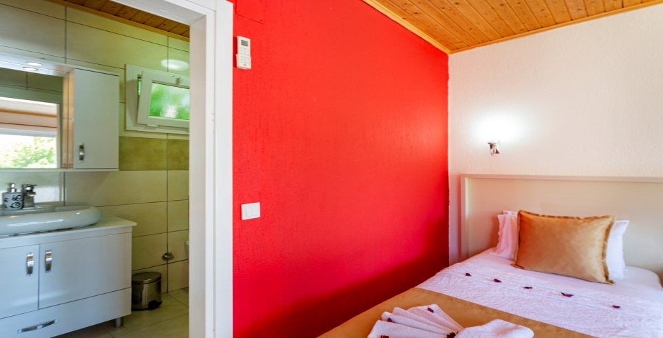 1. Yatak Odası : 1 adet çift kişilik yatak, klima, komodin, elbise dolabı, makyaj masası, TV, Jakuzi, banyo ve lavabo bulunmaktadır.