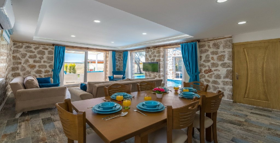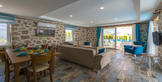 Salon : Kiralık yazlık villamızın salonunda klima, oturma grubu, sehpa, TV, uydu, internet, sehpa bulunmaktadır.