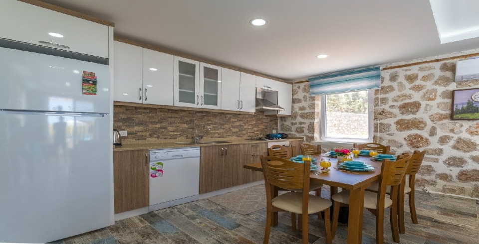 Mutfak : Amerikan mutfak, bulaşık makinesi, buzdolabı, ankastre fırın, ankastre 4'lü ocak, su ısıtıcısı, tencere ve tava takımı, yemek takımı, kaşık çatal bıçak takımı, bardak takımı, yemek masası ve sandalyeler bulunmaktadır.