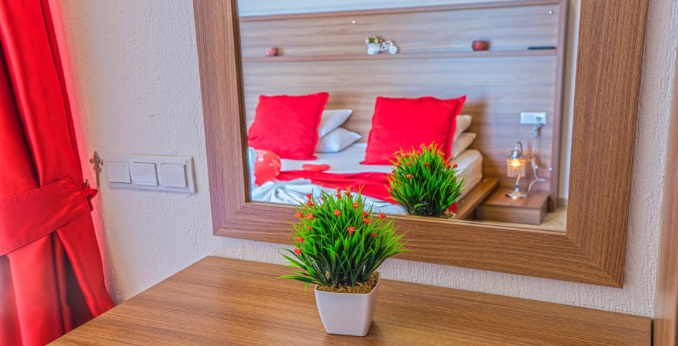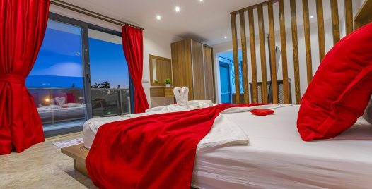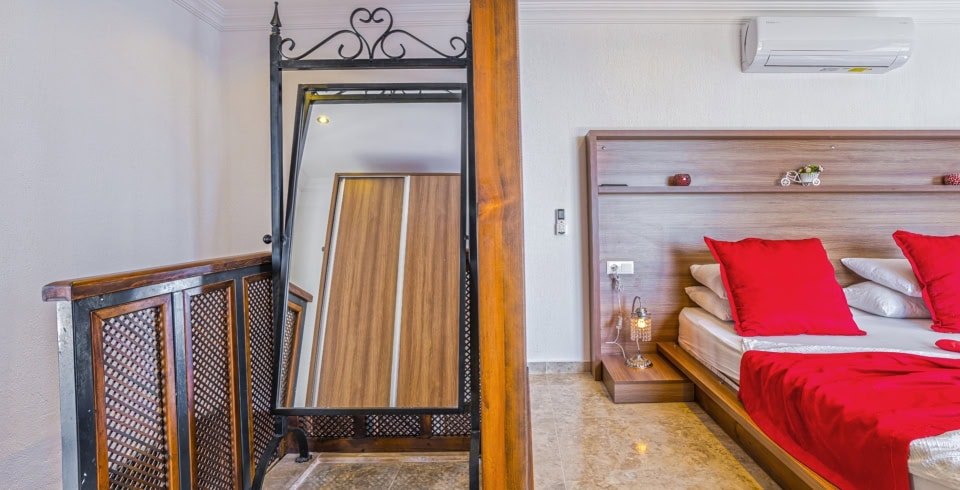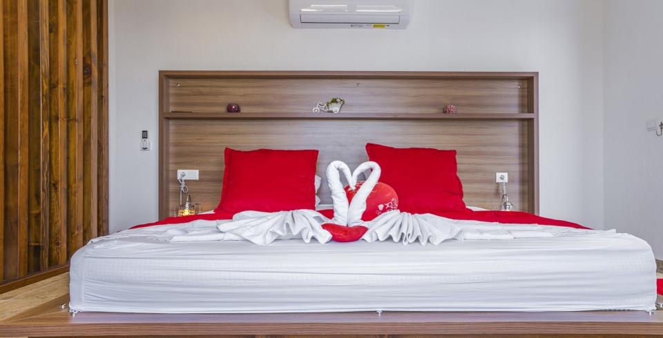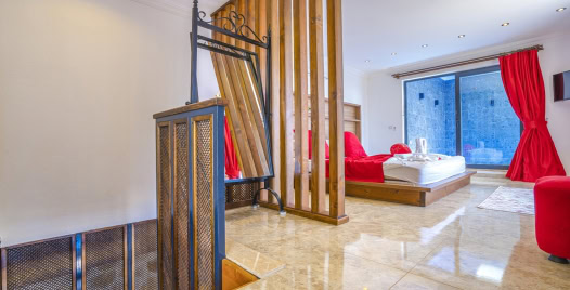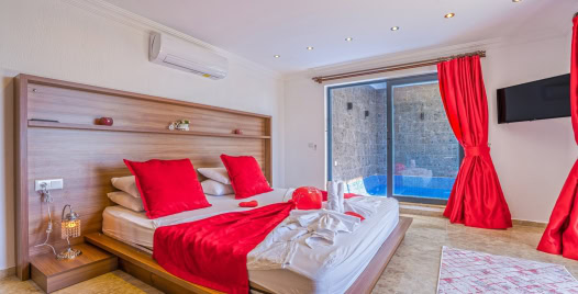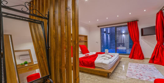 1. Yatak Odası : 1 adet çift kişilik yatak, klima,TV, komodin, elbise dolabı, makyaj masası, jakuzi, banyo ve tuvalet ve kapalı ısıtmalı havuza çıkış bulunmaktadır.