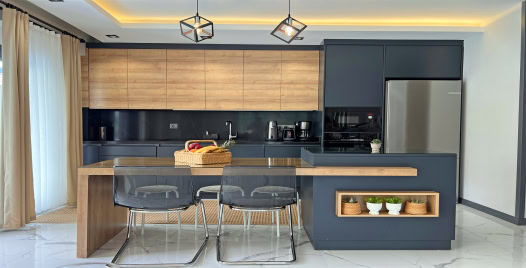 Mutfak : Modern Amerikan mutfak içerisinde yemek masası, buzdolabı, bulaşık makinası, fırın, ocak, mikrodalga fırın, kettle, yemek takımları, çatal ve bıçak takımları, tencere ve tava takımları, bardaklar bulunmaktadır.