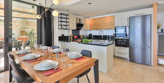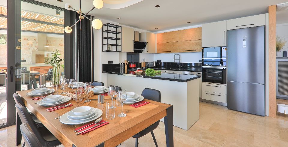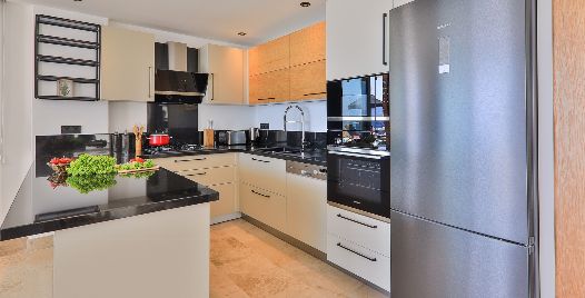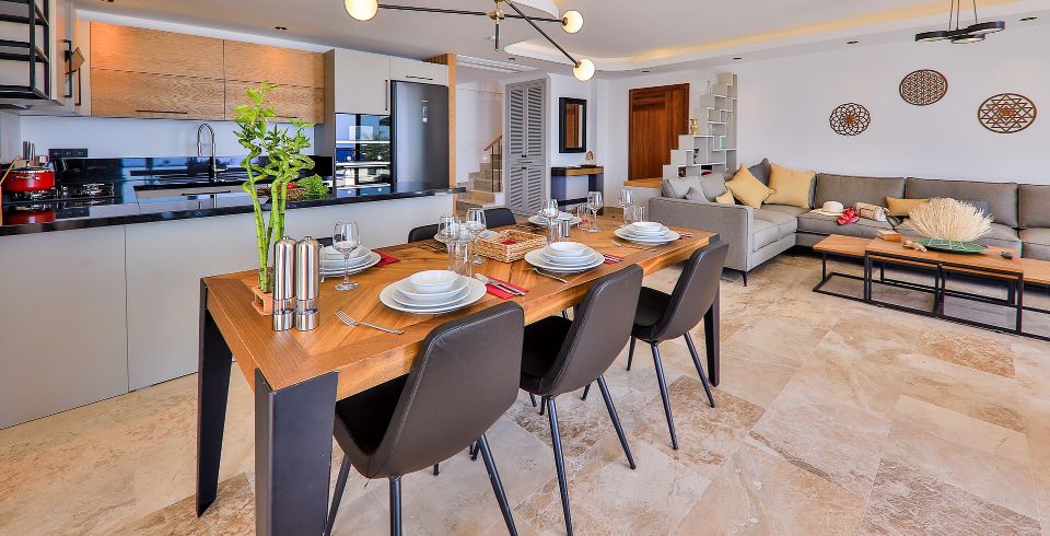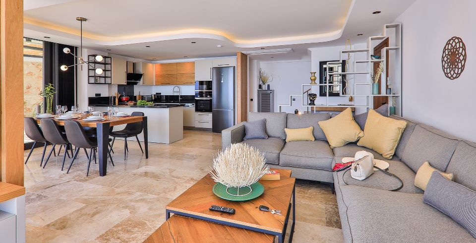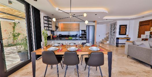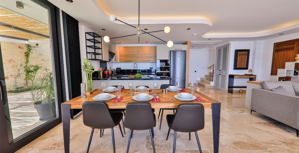 Mutfak : Amerikan mutfak bulunmaktadır. Mutfakta mikrodalga fırın, bulaşık makinası, ankastre fırın, buzdolabı, çamaşır makinası, ankastre 4’lü ocak, elektrikli su ısıtıcı kettle, ekmek kızartma makinası, tencere ve tava takımı, 8 kişilik yemek takımı, kaşık ve çatal seti ve bardaklar bulunmaktadır. Mutfak havuz katındadır.