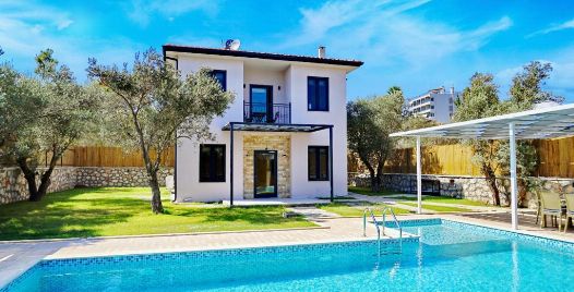Havuz ve Bahçe : Çam ağaçları arasında, şemsiye, bahçe mobilyası, şezlong, mangal ve yemek masası bulunmaktadır.
