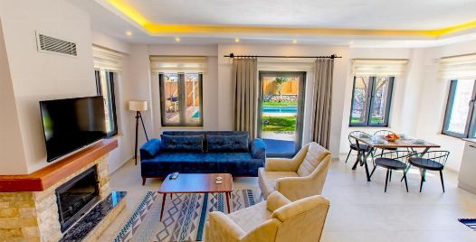 Salon : Oturma grubu, sehpa, televizyon (Smart TV), uydu alıcısı, klima, internet, terasa çıkış bulunmaktadır.