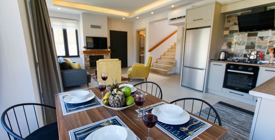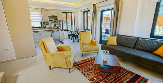 Salon : Oturma grubu, sehpa, televizyon (Smart TV), uydu alıcısı, klima, internet, terasa çıkış bulunmaktadır.
