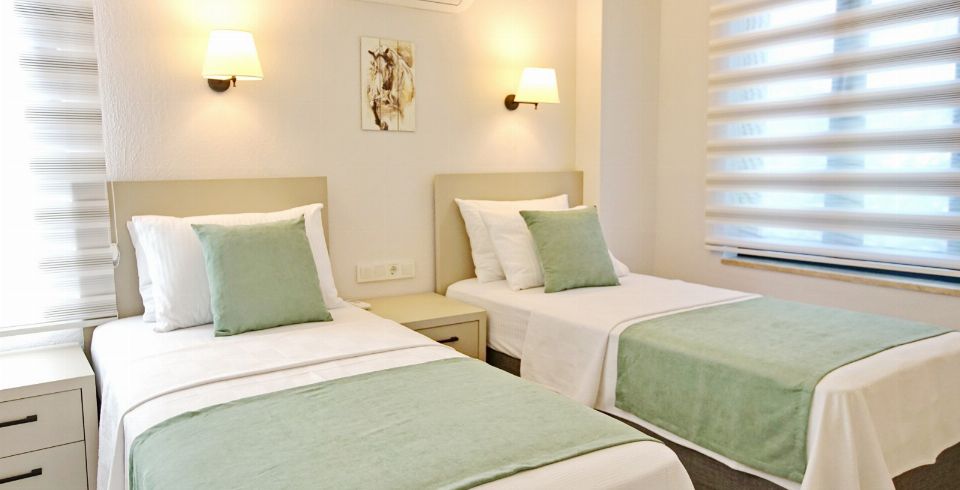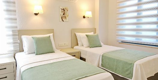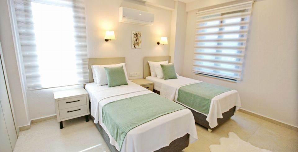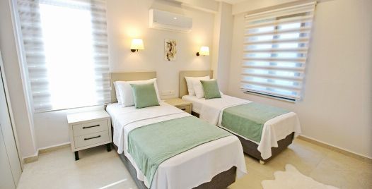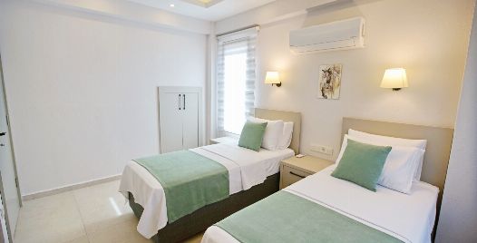 2. Yatak Odası : 2 adet tek kişilik yatak, klima, komodin, elbise dolabı, banyo ve lavabo bulunmaktadır.