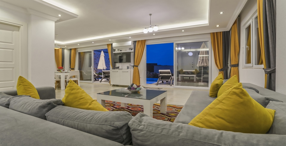 Salon : Villa Esinti’nin salonunda sizi şık bir oturma grubu ile klima, TV, internet, uydu, koltuk, sehpa ile ferah bir salon bekliyor olacaktır. Havuz terasına çıkış yapılmaktadır.