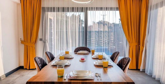 Mutfak: Açık planlı mutfak, 8 kişiye yetecek kadar mutfak malzemeleri, buzdolabı, fırın, ocak, mikrodalga fırın, bulaşık makinesi, çamaşır makinesi, tost makinesi, kettle ve çaydanlık bulunmaktadır..