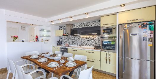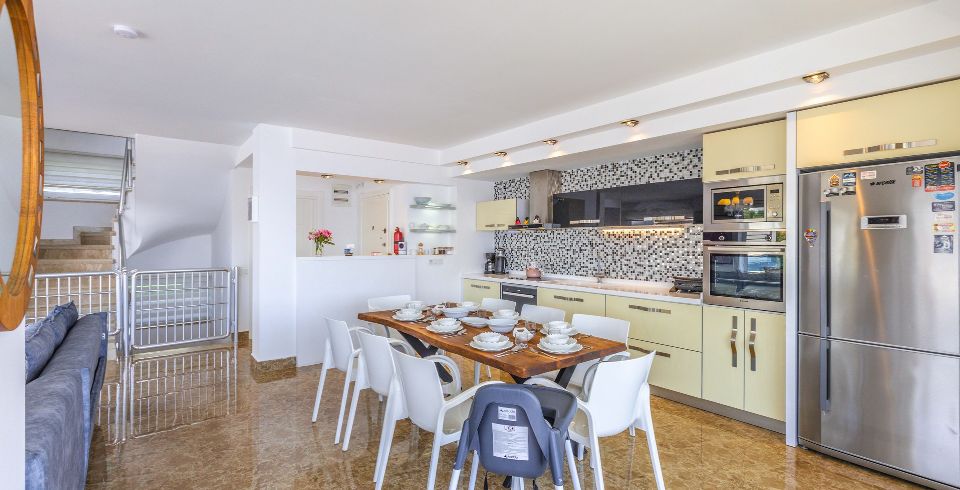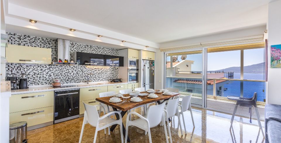Mutfak : Deniz manzaralı Amerikan mutfak Detayları; Buzdolabı, çamaşır makinası, bulaşık makinası, yemek masası, su sebili, su ısıtıcısı, ekmek kızartma makinası, fırın,4'lü ankastre ocak, mikro dalga ve mutfak araç gereçleri bulunmaktadır.