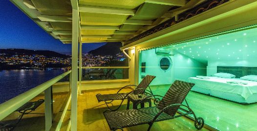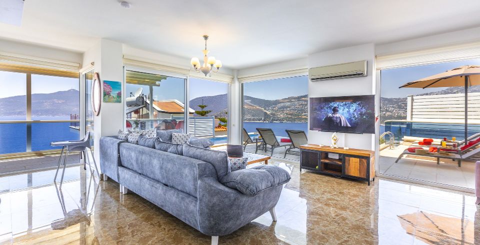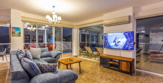 Salon : Deniz manzaralı modern Salona sahip olup Detayları; TV, uydu, oturma grubu, DVD, internet, klima, WC ve lavabo bulunmaktadır.