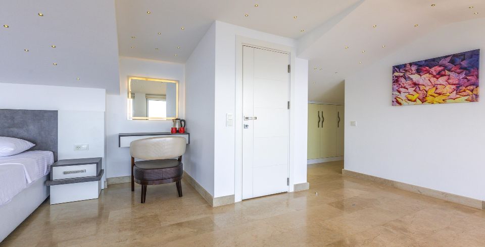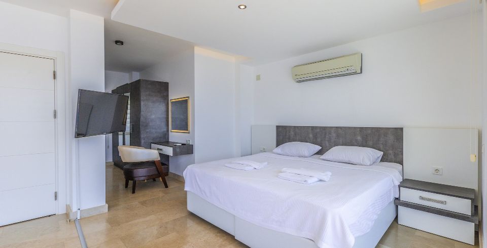 1. Yatak Odası : En süit yatak odası çift kişilik yatak, klima, komodin, makyaj masası, elbise dolabı, balkon, TV, banyo ve lavabo bulunmaktadır.