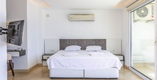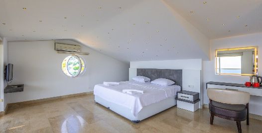 2. Yatak Odası : Süit yatak odası çift kişilik yatak, elbise dolabı, makyaj masası, komodin, klima, teras, banyo ve lavabo bulunmaktadır.