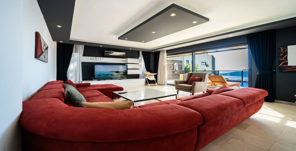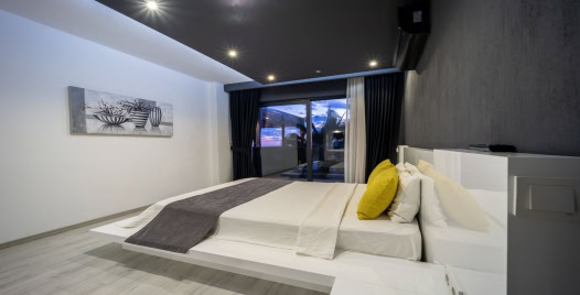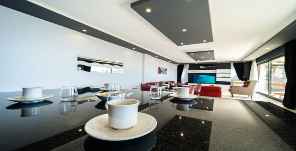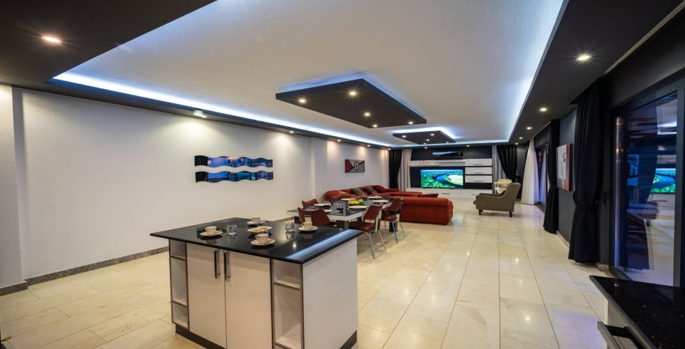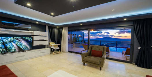 Salon : Muhteşem manzaraya sahip salon içerisinde konforlu oturma grubu, TV, internet ve klima yer almaktadır. Salondan havuz terasına geçiş vardır.