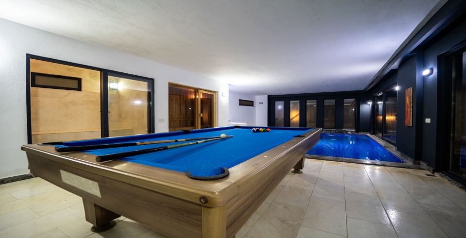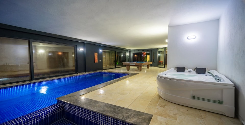 Villanın en özel özelliklerinden biri olan ısıtmalı iç havuz, serin günlerde bile tatilinize sıcaklık katar. Jakuzi, sauna ve Türk hamamı, tatilinize spa keyfi katarken, günün tüm yorgunluğunu geride bırakmanızı sağlar. Bilardo masası ve masa tenisi, sevdiklerinizle keyifli rekabetlere sahne olurken, özel ofis alanı işlerinizi tatil sırasında da kolayca halledebilmenize olanak tanır.Kendinizi ve sevdiklerinizi şımartmak için tasarlanan Villa Everest, tatilinizi unutulmaz kılmak için sizi bekliyor!