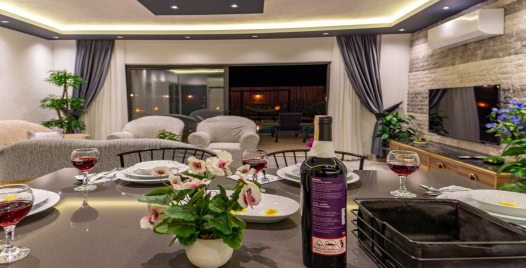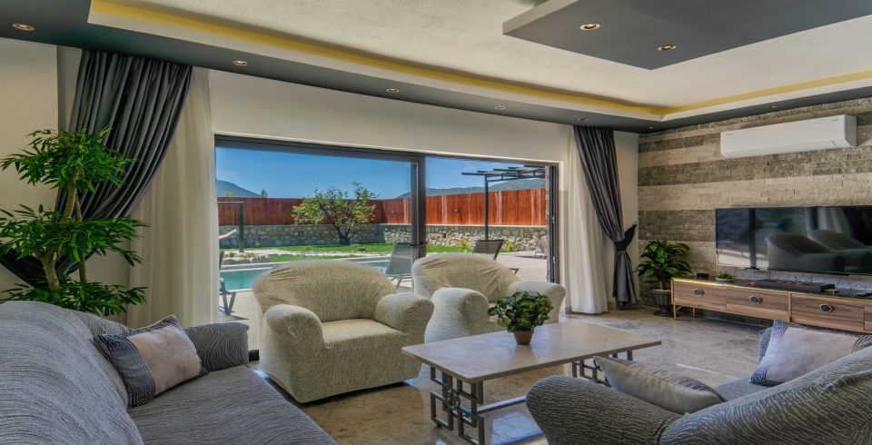 Salon: Villa salonunda oturma grubu, klima, TV, internet, uydu alıcı, yemek masası, sehpa bulunmaktadır.