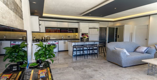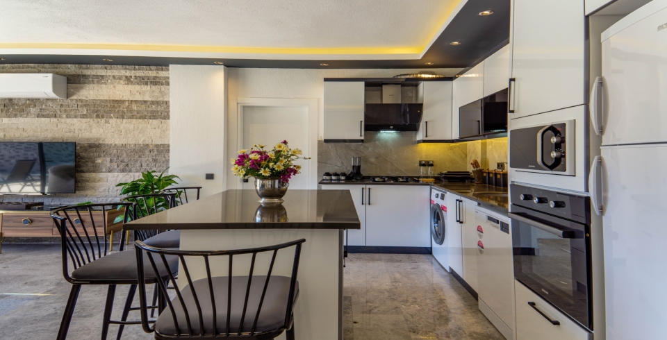 Mutfak: Villamızın mutfağında buzdolabı bulaşık makinası, çamaşır makinesi,4 lü ocak, kettle, mikrodalga fırın, 4 kişilik yemek takımı bulunmaktadır.