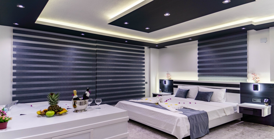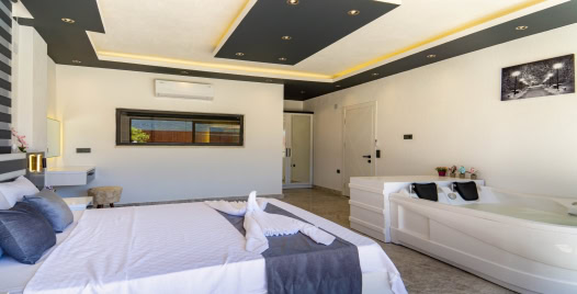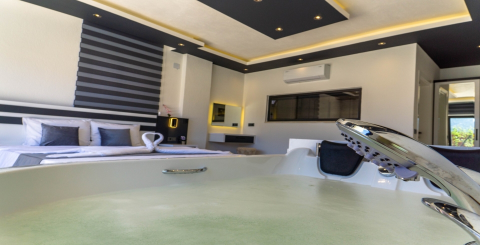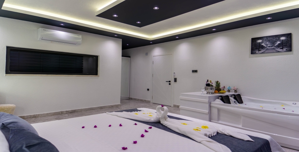 1: Yatak Odası: Çift kişilik yatak, klima, komodin, jakuzi, elbise dolabı, makyaj masası, banyo ve tuvalet bulunmaktadır.