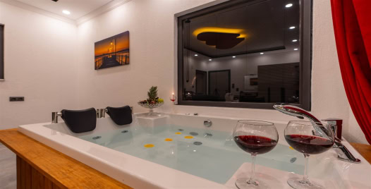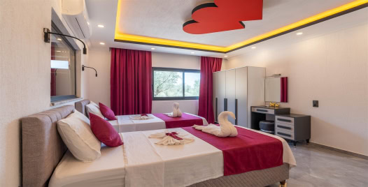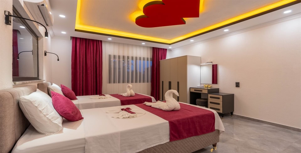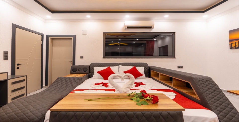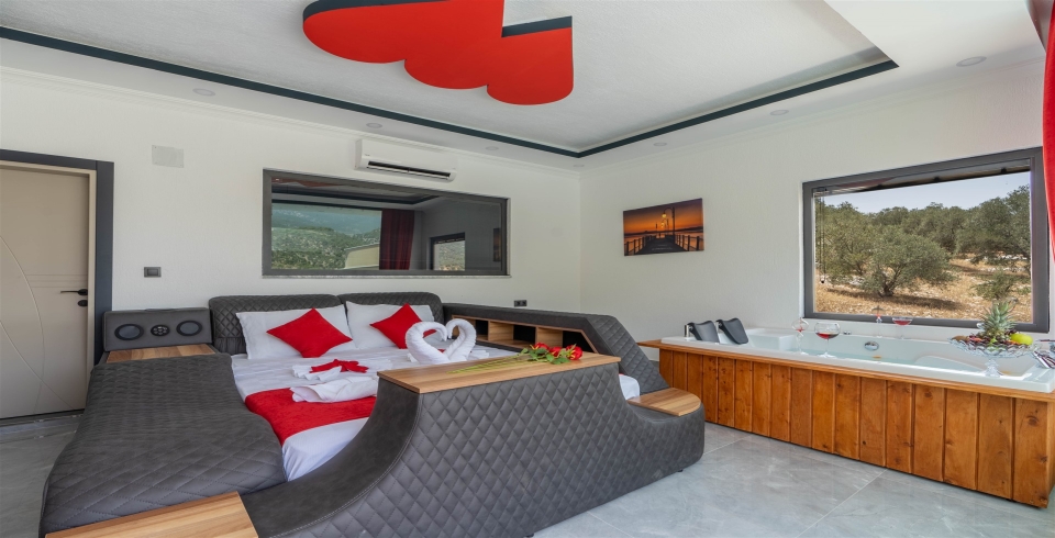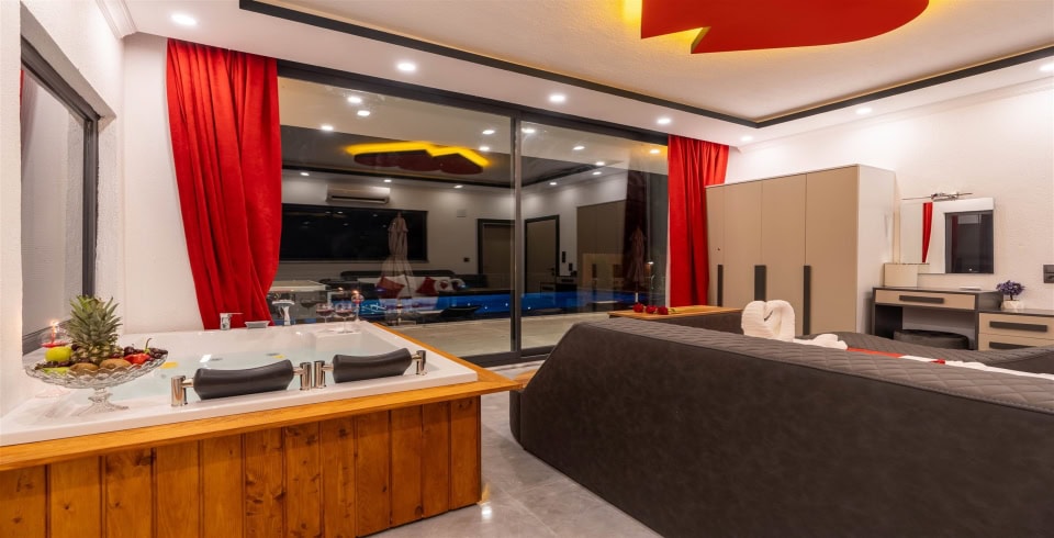 1. Yatak Odası : 1 adet çift kişilik akıllı yatak, klima, komodin, Jakuzi elbise dolabı, makyaj masası, banyo ve tuvalet bulunmaktadır.