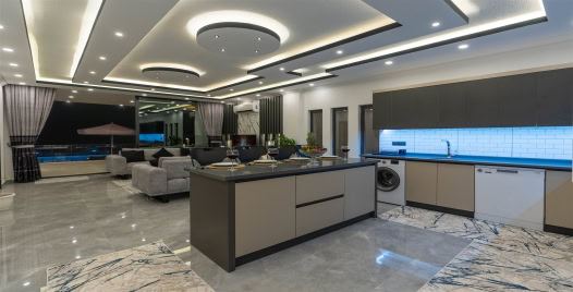 Mutfak : Ferah Amerikan tarzı mutfak, buzdolabı, bulaşık makinesi, yemek masası, fırın, 4'lü ocak, kettle, 4 kişilik yemek takımı, tava, tencereler, çatal, bıçak takımı bulunmaktadır.