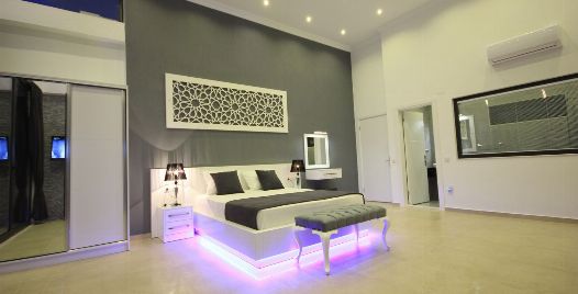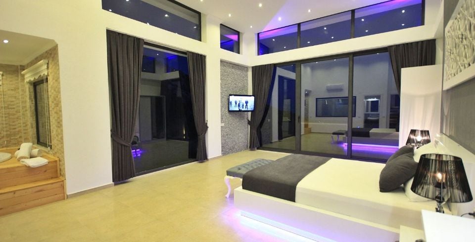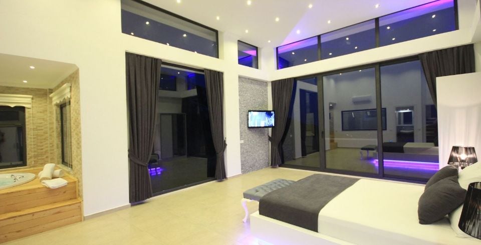 1, Yatak Odası: Çift kişilik süit yatak odası, klima, elbise dolabı, makyaj masası, komodin, banyo, lavabo ve jakuzi bulunmaktadır.