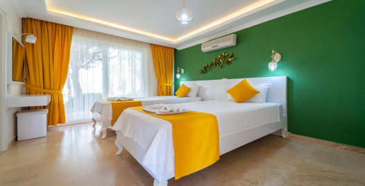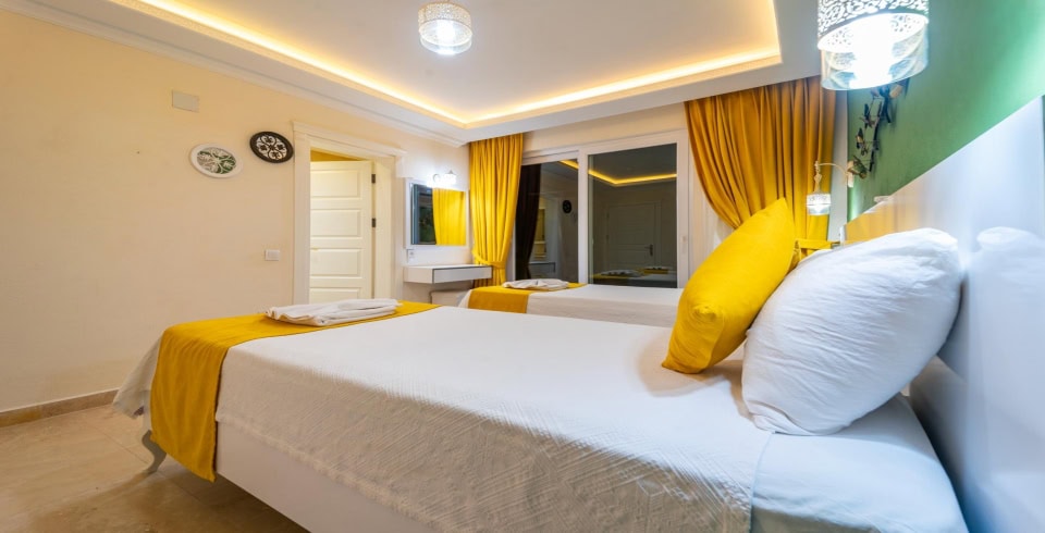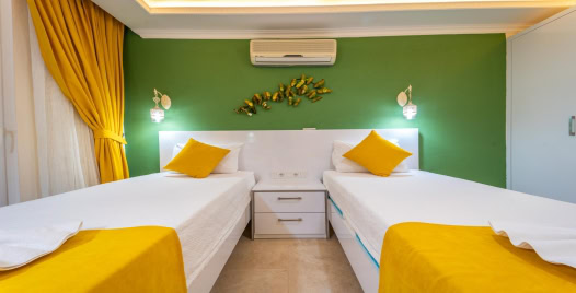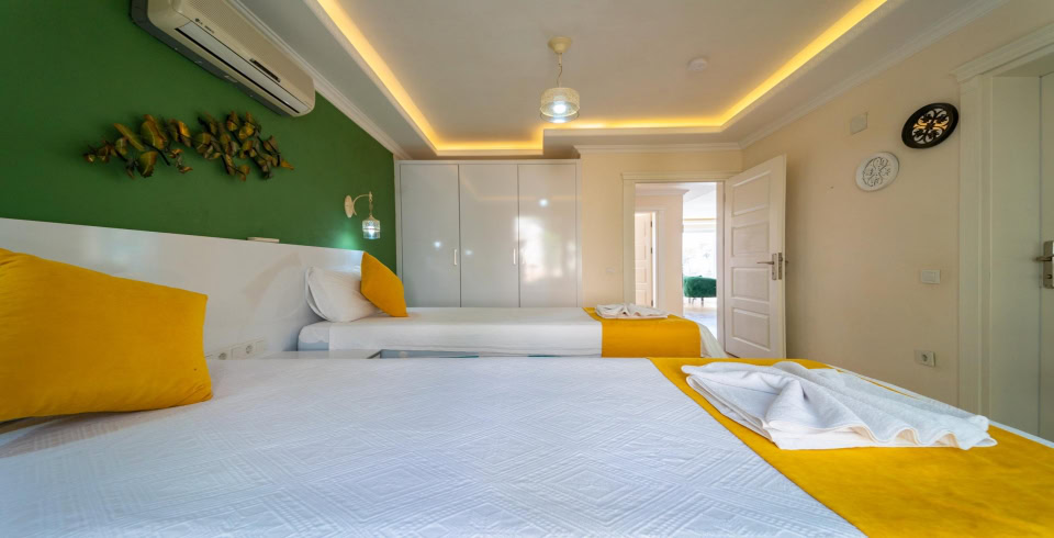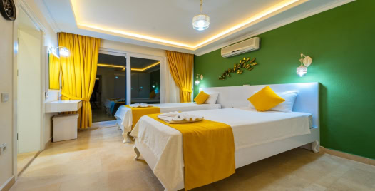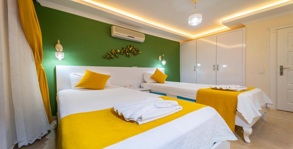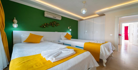 2. Yatak Odası : 2 adet tek kişilik yatak, komodin, klima, makyaj masası, elbise dolabı, banyo ve tuvalet bulunmaktadır.