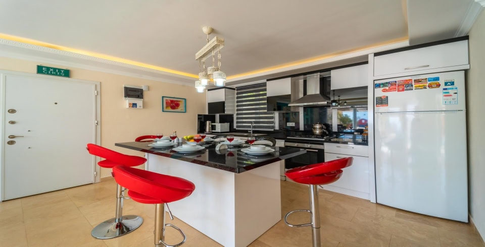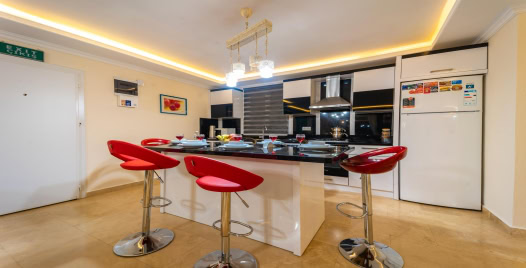 Mutfak : Mutfağında amerikan mutfak 4 kişilik yemek takımı, buzdolabı, çamaşır makinası, mikrodalga fırın, 4 lü ocak, ekmek kızartma makinası, kettle , çatal bıçak takımı, tencere tava takımı, bulaşık makinası bulunmaktadır.