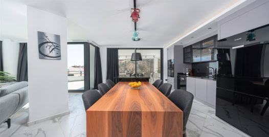 Mutfak: Modern Amerikan mutfak içerisinde ankastre 4lü ocak, ankastre fırın, mikrodalga fırın, yemek masası, tost makinesi, buzdolabı, bulaşık makinesi, ekmek kızartma makinesi, su ısıtıcısı, bardak takımı, yemek takımı, çatal-bıçak takımı, çamaşır makinesi, tavalar, tencereler ve diğer yemek pişirme ekipmanları bulunmaktadır.