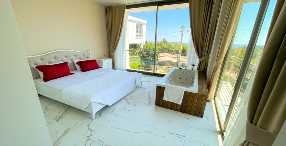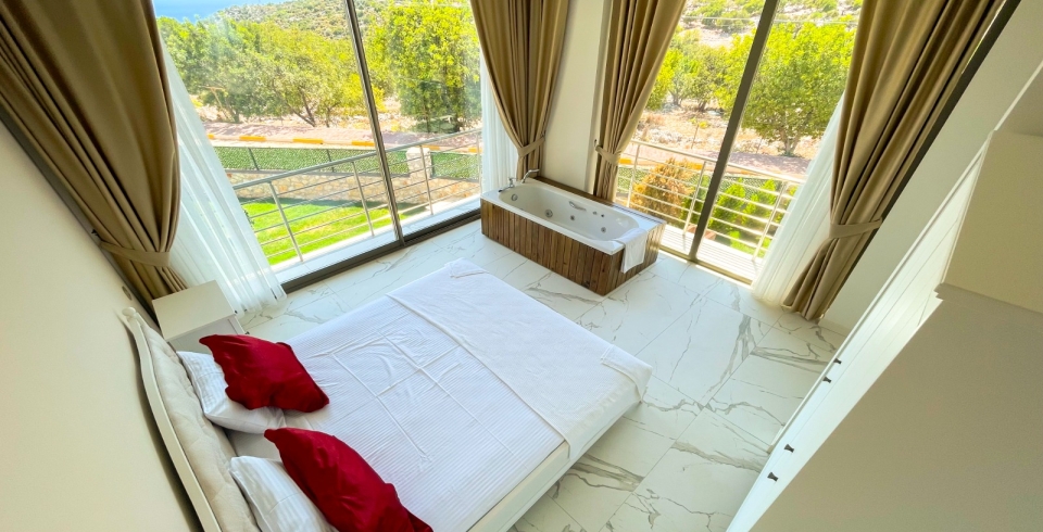 1. Yatak Odası : 1 adet çift kişilik yatak, klima, komodin, elbise dolabı, makyaj masası, jakuzi, balkon, banyo ve tuvalet bulunmaktadır.