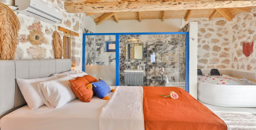 1. Yatak Odası : Çift kişilik yatak, klima, makyaj masası, komodin, jakuzi, lavabo ve banyo bulunmaktadır.