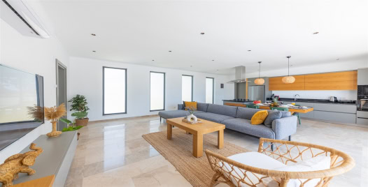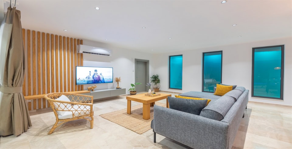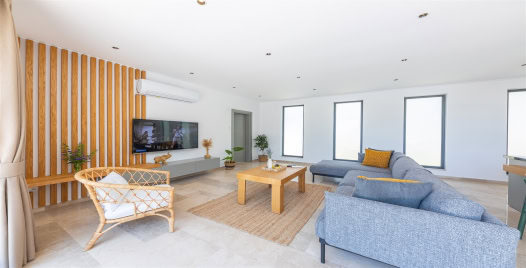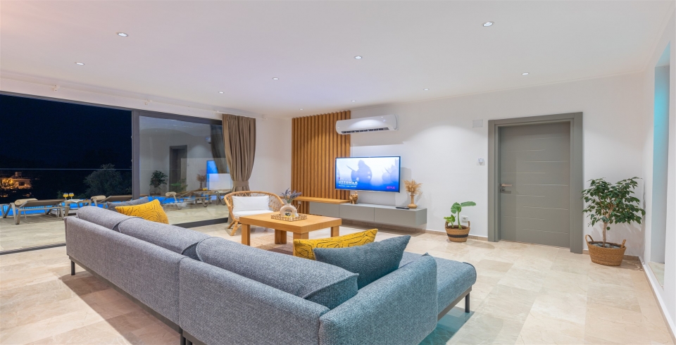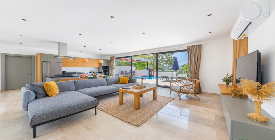 Salon : Kiralık Villamızın salonunda konforlu oturma grubu, klima, TV, internet, uydu alıcı, yemek masası, sehpa bulunmaktadır.