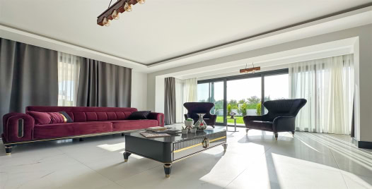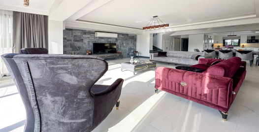 Salon: Oturma grubu, Uydu TV(4K Ultra H), 8 Kişilik yemek masası, Klima, Havuz kenarına çıkış bulunmaktadır.