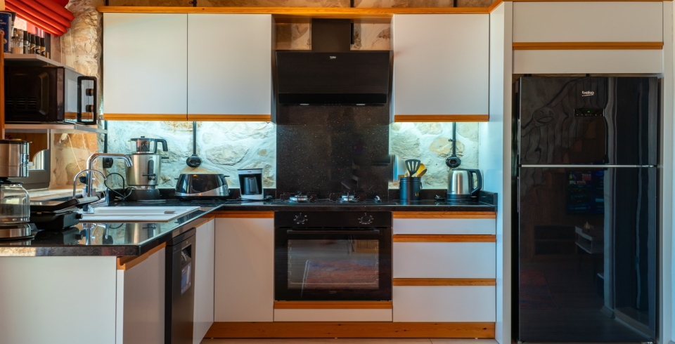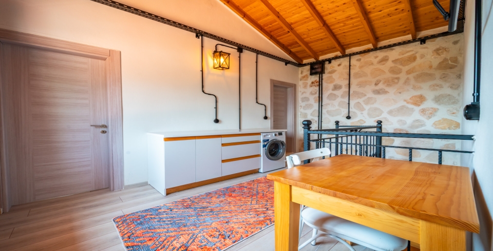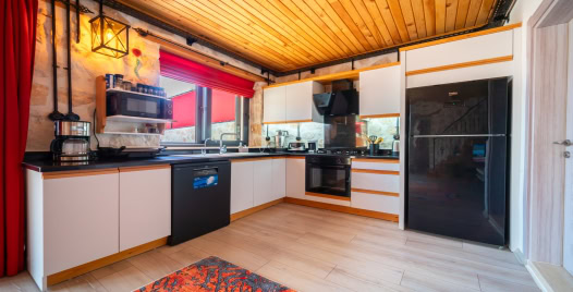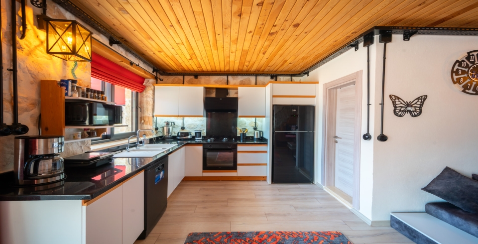 Mutfak : Amerikan açık mutfak ve salona sahip villamızın mutfağında buzdolabı, bulaşık makinası, ankastre ocak, fırın, mikrodalga, 4'lü ankastre ocak, kettle, çamaşır makinası, yemek masası ve temel mutfak araç ve gereçleri bulunmaktadır.