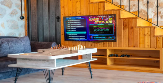 Salon : Kiralık villamızın salonunda oturma grubu, TV, uydu, internet, DVD, sehpa bulunmaktadır.