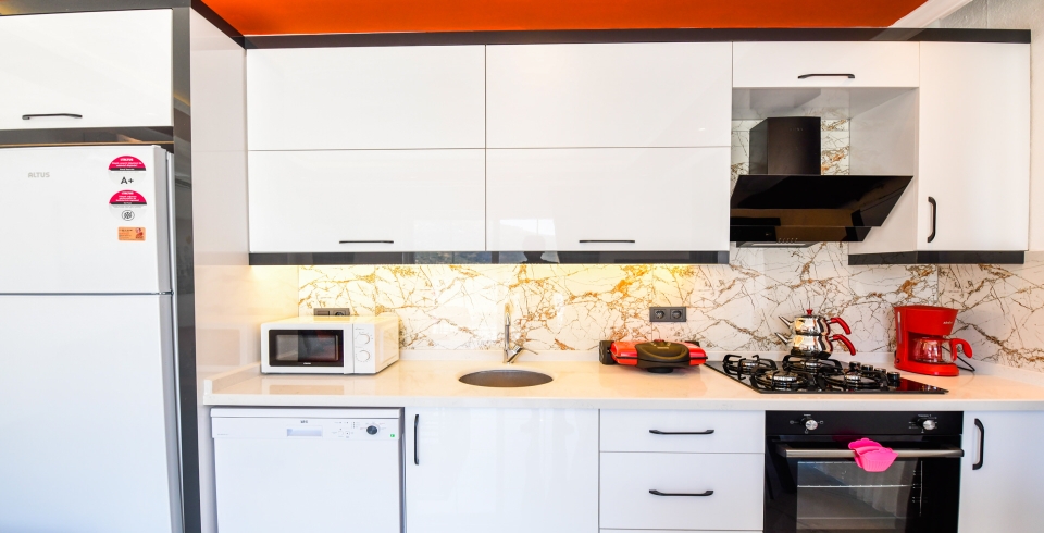 Mutfak: Açık planlı mutfak, 4 kişiye yetecek kadar mutfak malzemeleri, buzdolabı, fırın, ocak, mikrodalga fırın, bulaşık makinesi, çamaşır makinesi, tost makinesi, kettle ve çaydanlık bulunmaktadır..