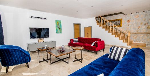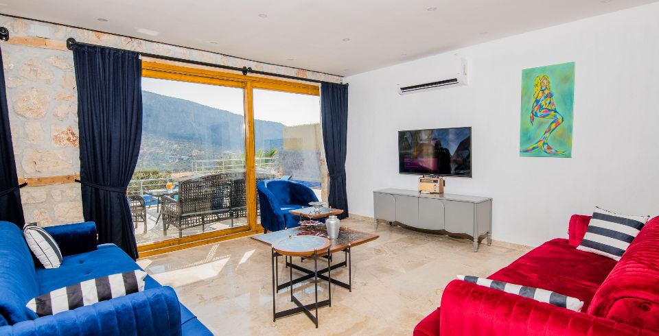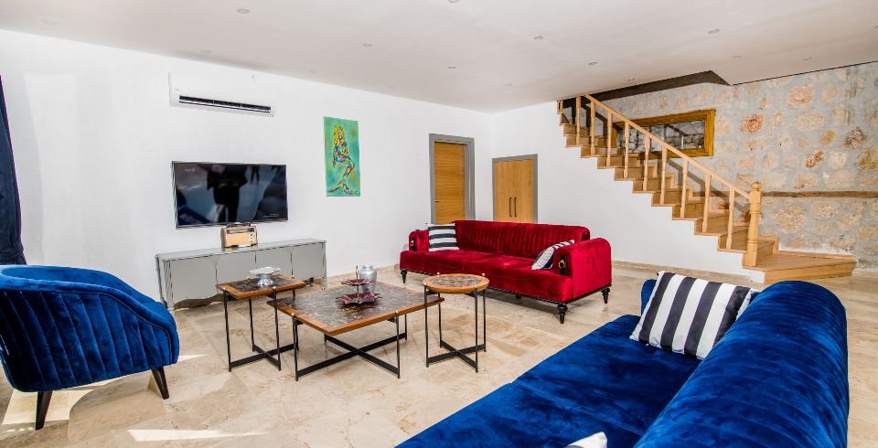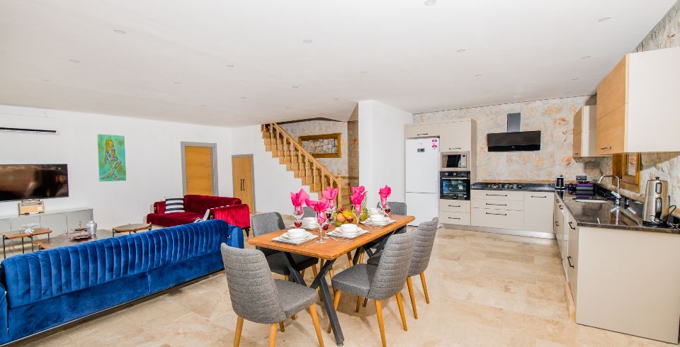 Salon: Villa salonunda konforlu oturma grubu, klima, TV, internet, uydu alıcı, yemek masası, sehpa bulunmaktadır.