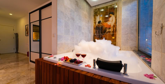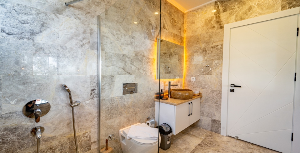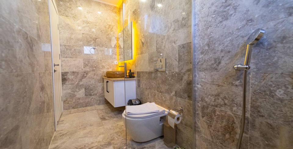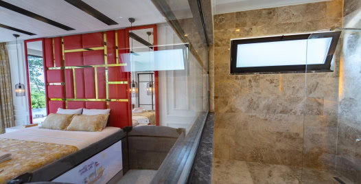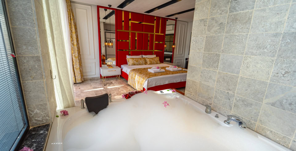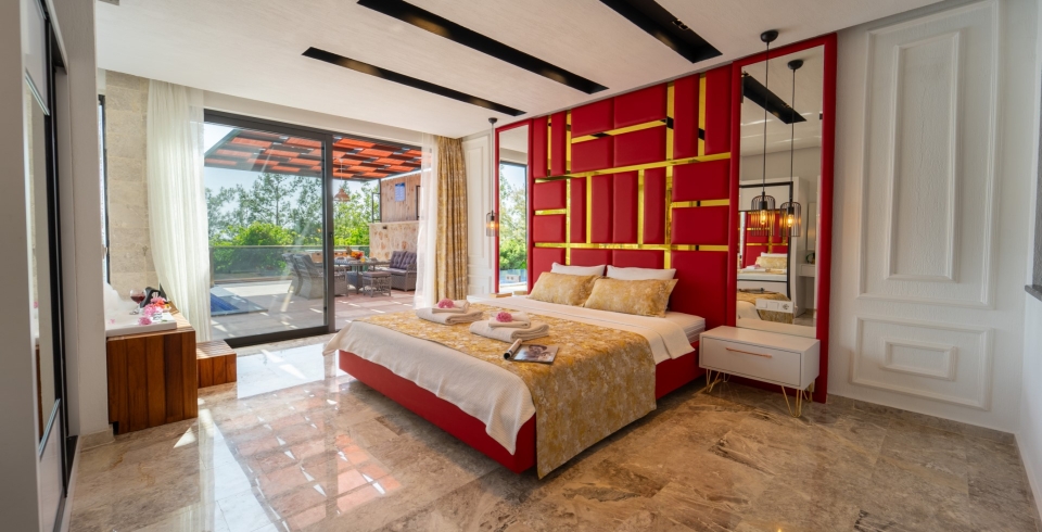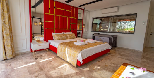 1. Yatak Odası: Çift kişilik yatak, klima, jakuzi, komodin, elbise dolabı, makyaj masası, banyo ve tuvalet bulunmaktadır.