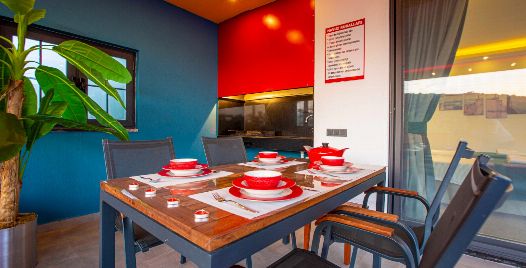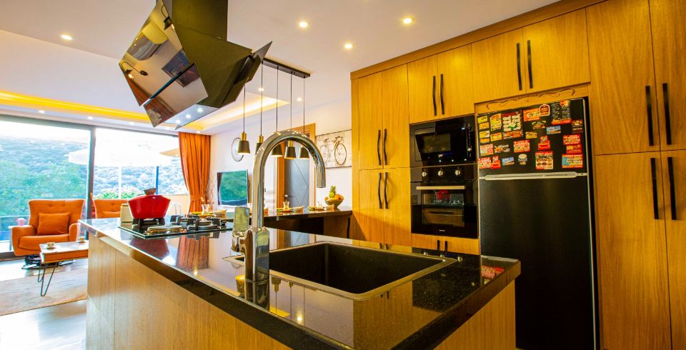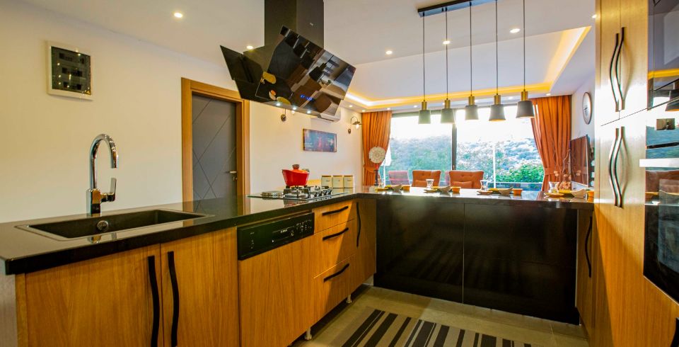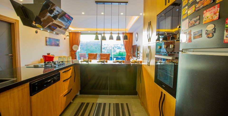 Mutfak : Tam donanımlı modern bir Amerikan mutfağa sahiptir. Bu modern Amerikan mutfak içerisinde buzdolabı, bulaşık makinesi, fırın, ocak, elektrikli su ısıtıcı, yemek masası, yemek takımları, çatal ve bıçak takımları, tencere ve tava takımları ve bardaklar bulunmaktadır.