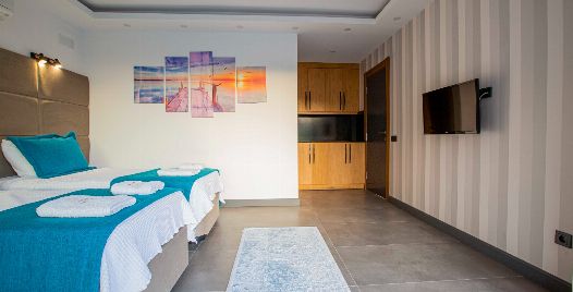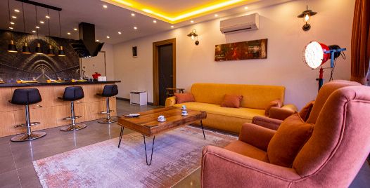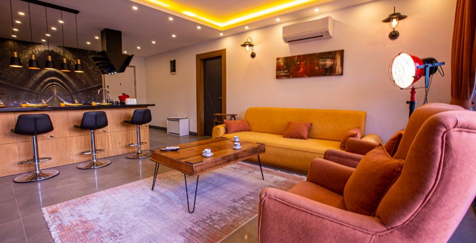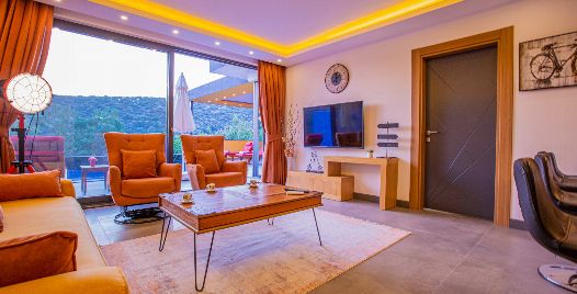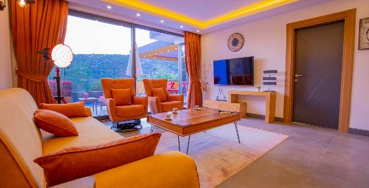Salon: Tüm detaylar düşünelerek oluşturulmuş manzaralı salonda konforunuz için tasarlanan oturma grubu, TV, klima, sehpa, DVD oynatıcı bulunmaktadır.