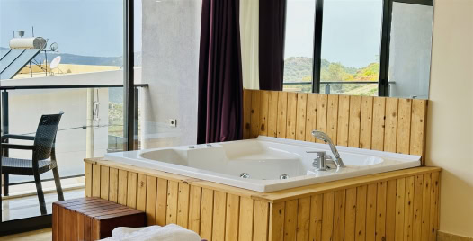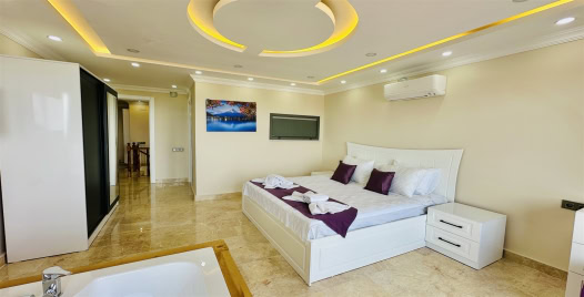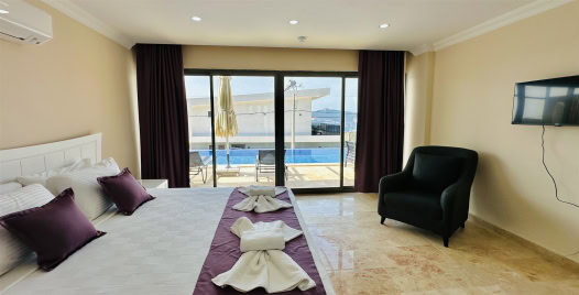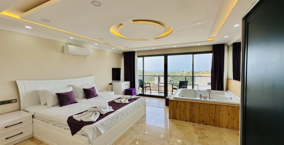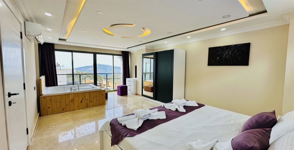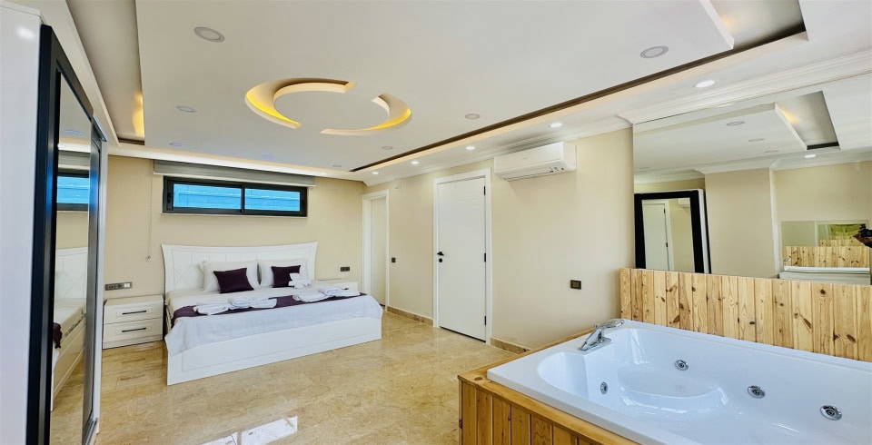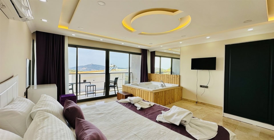 5. Yatak Odası : Çift kişilik yatak, komodin, klima, balkon, jakuzi, TV, banyo ve lavabo bulunmaktadır.