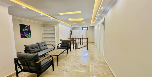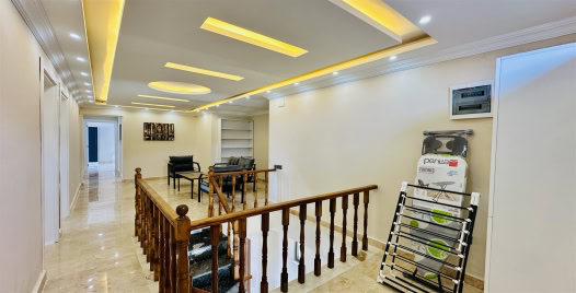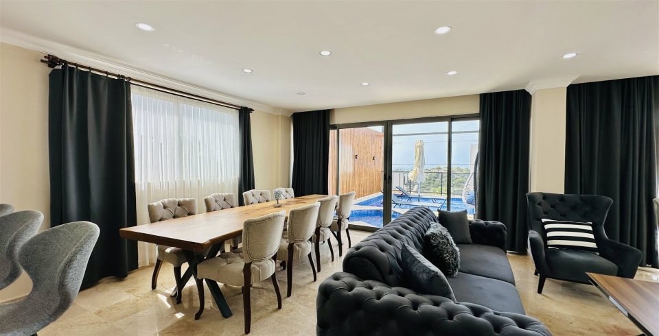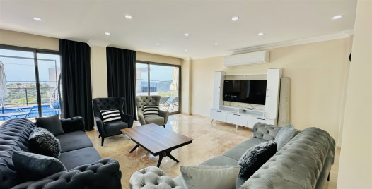 Salon : Villamızın iç dizaynı da son modaya uygun olarak modern bir şekilde tasarlanmıştır. Çeşitli dekoratif eşyalarla süslediğimiz salonumuz havuzlu bahçeye açılıyor. Villa salonunda oturma grubu, TV, internet, salıncak klima, yemek masası, sehpa bulunmaktadır.