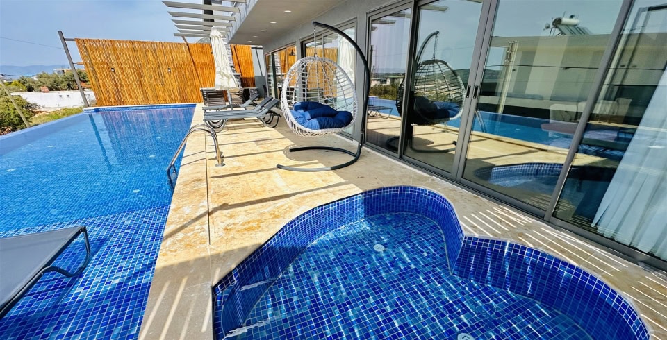 Havuz ve Bahçe : Villamız korunaklı olduğundan dışarıdan görünmemektedir. 1.55 metre sığ özel yüzme havuzunun içinde şezlong bulunan bahçemizde ekstra şezlonglar, çocuk havuzu, şemsiye, yemek masası, barbekü oturma alanı ve salıncak bulunmaktadır.